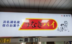 静岡の有名企業のPR戦略を紹介する番組で、「うなぎパイ」を製造・販売する会社などに協力いただきました!(写真は駅にあった広告看板です。)